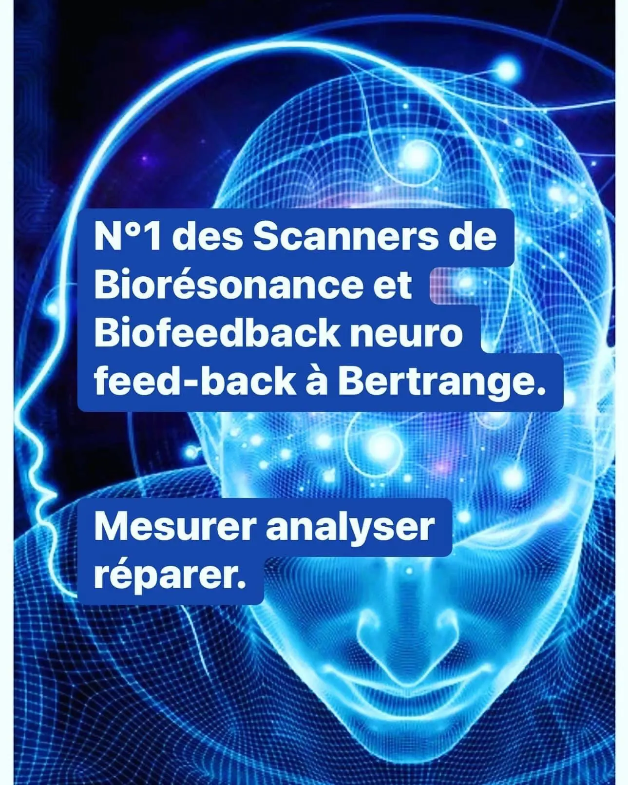 La biorésonance et le biofeedback, grâce aux scanners d’analyse vibratoire dernière génération donne à chacun d’entre nous, la possibilité d’effectuer un bilan complet énergétique tant sur le plan physique qu’émotionnel. Des algorithmes détectant vos déséquilibres passés présents et futurs permettent ainsi d’anticiper ces divers dysfonctionnements. À la suite de ces bilans, vous bénéficierez d’un rééquilibrage immédiat de vos déséquilibres. Ces systèmes bioénergétiques quantiques sont dotés d’une intelligence artificielle et ont aussi un rôle préventif indéniable, ainsi qu’un soutien puissant au bien-être quotidien.