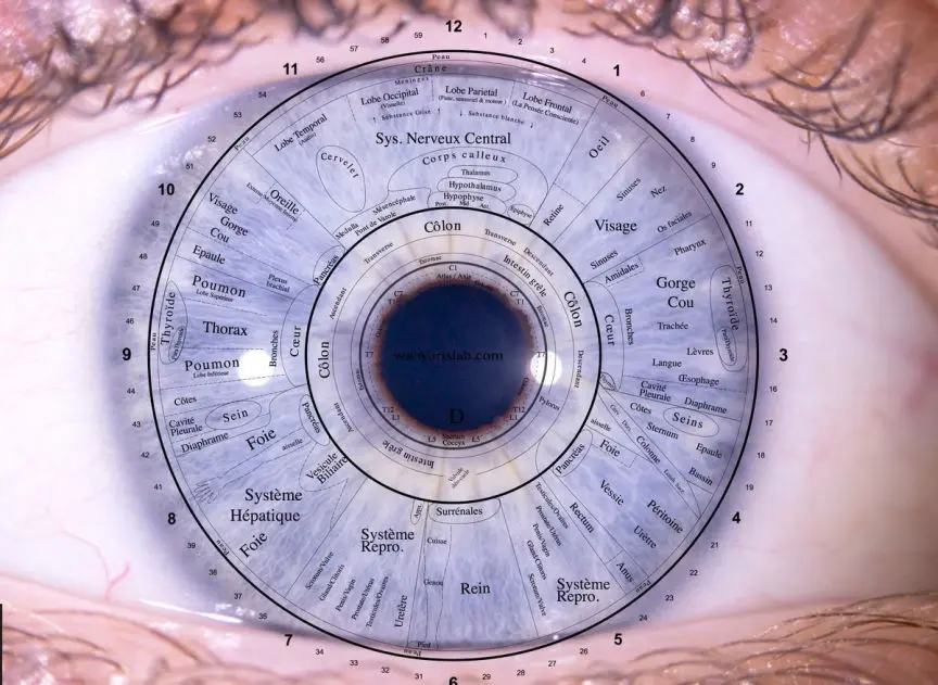 L’iridologie est l‘étude de l’iris (la partie colorée de l’oeil). Cette étude est un moyen technique qui permet une approche particulière en rapport avec l‘état de santé d‘un patient. L‘oeil est un peu comme le miroir de notre corps, chaque organe et son état y sont représentés. La lecture de ces informations peut permettre d’affiner un diagnostic.